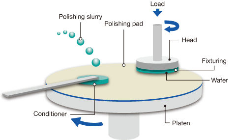 在集成電路(ICs)中對間層電介質(zhì)(ILDs)和金屬層進(jìn)行平面化,以減少寄生電容、提高可靠性并實(shí)現(xiàn)多級互連。 對淺溝槽隔離(STI)結(jié)構(gòu)進(jìn)行平面化,以隔離活性設(shè)備并防止漏電流。 對絕緣體上的硅(SOI)基板進(jìn)行平面化,增強(qiáng)設(shè)備性能并減少功耗。 對微電機(jī)電子系統(tǒng)(MEMS)進(jìn)行平面化,以提高功能性并與ICs集成。 對計(jì)算機(jī)硬盤的磁盤和讀/寫頭進(jìn)行平面化,以增加存儲密度和數(shù)據(jù)傳輸率。 在CMP過程中,晶片被固定在一個(gè)旋轉(zhuǎn)夾具上,并被壓在一個(gè)旋轉(zhuǎn)的拋光墊上。同時(shí),一種磨料化學(xué)液體(稱為漿料)在晶片和墊之間分布。化學(xué)漿料弱化了晶片的表面,允許墊的粗糙度去除材料。此過程重復(fù),直到達(dá)到所需的平面度。