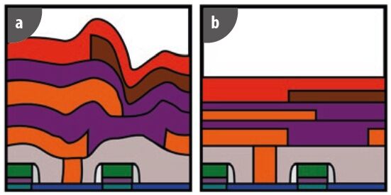 圖3. 晶圓制造 (a) 未使用CMP 和 (b) 使用CMP