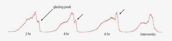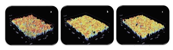 圖8. 圖像顯示了在拋光過程中墊面粗糙度高度的變化。經(jīng)過幾個(gè)小時(shí)的拋光后,表面分布中出現(xiàn)了一個(gè)“光澤峰”。通過在拋光過程中定期監(jiān)測墊面,可以適當(dāng)?shù)卣{(diào)整墊面(干預(yù)),以將表面狀態(tài)恢復(fù)到初始狀態(tài)。