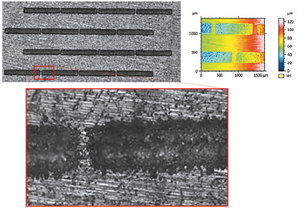 SensofarS neox 3D光學輪廓儀已成為MTC表面織構開發的一個組成部分。在與一家汽車公司進行的合作實驗研究中(該研究為歐洲資助的Prometheus項目的一部分),在MTC開發了表面織構,并使用飛秒激光系統將其應用到汽車內燃機缸套部分的曲面上。圖1為激光毛化缸套部分和使用3D輪廓儀描繪的織構示例。
