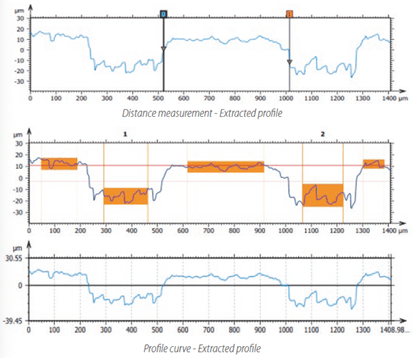 然后使用SensoMAP軟件,可以使用圖3所示的捕獲序列來分析織構。首先,從形貌圖層中提取織構特征的輪廓曲線(圖3a );可用于確定織構形狀的臨界尺寸,例如凹槽寬度和深度。臺階高度分析工具(圖3b)和距離測量函數(圖3c)都可用于識別此關鍵數據,從而能夠分析未毛化表面和織構形狀之間的轉變,這對于指示激光毛化表面的摩擦性能至關重要。雖然距離測量給出了曲面上2個點的尺寸,根據用戶的手動設置,臺階高度可提供平均高度差,從而對激光毛化工藝的深度變化進行更加準確的評估。