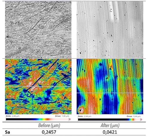 可以看出,由于采用干涉測量法拍攝黑白圖像和彩色地圖圖像,采用DLyte工藝之后,用低于0.05 µm的Sa參數定量的樣品表面粗糙度降低。
