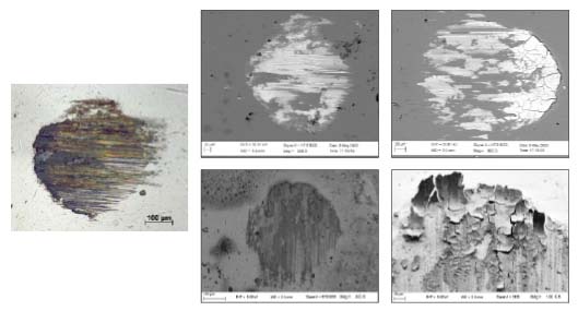 圖1. 與各種W-C:H涂層和在不同條件下的摩擦過程中,在磨損球帽上形成的轉移層的SEM(及光學顯微鏡)顯微照片。