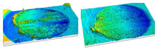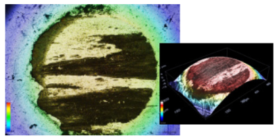 為了獲得這些數據,我們對初始球、測試后的磨損球帽(一些例子顯示在圖2、3和4中)進行了3D地形測量,并與和不帶轉移層的情況進行了比較。轉移層的厚度的3D分布可以作為最后兩張圖像之間的差異獲得,而球的磨損體積則可以作為初始球和不帶轉移層的球之間的差異獲得。