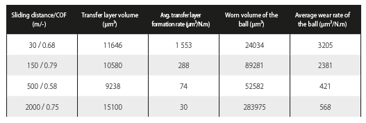 我們已經測量了在摩擦測試中到預定長度的所研究的W-C涂層/鋼球系統中轉移層和鋼球磨損的演變。結果顯示在下表中: