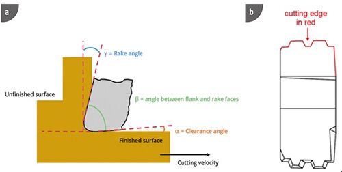 圖1.a) 切削工具中一些感興趣的參數(shù)。 b) 插入物的圖示。紅線顯示的是在這個案例研究中正在評估的切削刃剖面。
