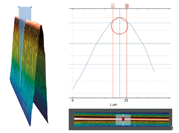 圖 2. 頂部顯示了用 100X Ai Focus Variation HDR 測量的圓形切削刃的 3D 地形。橫截面輪廓顯示在底部,頂視圖顯示在右側(cè)。