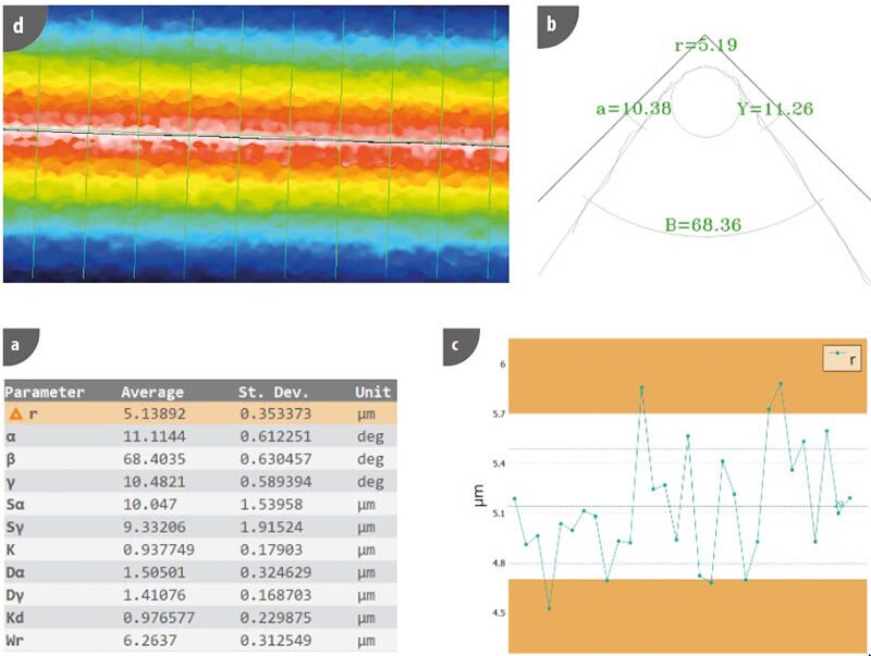 圖5. SensoPRO“Edge”插件的結(jié)果。a)切削工具參數(shù)列表。b)15個橫截面輪廓之一,具有相應的切削刃半徑、間隙和后角。c)切削刃半徑(y軸)與每個輪廓編號從1到30的圖中的超差區(qū)域(橙色顯示)(x軸)。d)具有橫截面輪廓的切削刃拓撲的示例。