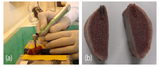 在研究中,我們在置入牛肋骨(模擬人的骨骼,圖 2)之前和之后分別在四個不同的位置(圖 1)用共聚焦技術測量了牙種植體。