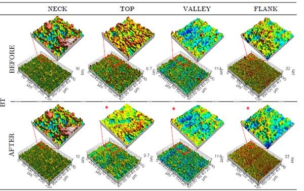 圖 4 顯示了在置入酸蝕刻植入體之前和之后,在相同區域進行的測量結果的軸測代表性投影。顯示出了具有統計學意義的形貌參數變化 (p<0.05) 的部位以 * 標示。可以注意到,最初出現的尖峰在所有研究部位(除頸部外)皆已置入后變得不太明顯或已經完全消失。