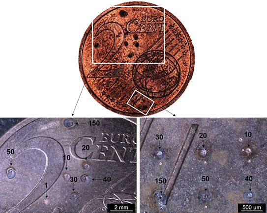 對于使用實驗室儀器進行的測量,在燒蝕坑周圍可見物質噴出(圖 7)。此外,使用實驗室儀器形成的燒蝕坑都會有因物質積聚而形成的“坑沿”。這些坑沿相對于硬幣表面的高度在 4 µm 至 20 µm 之間,具體取決于發射的激光次數。