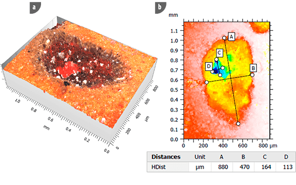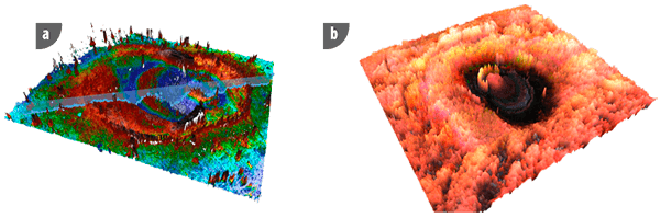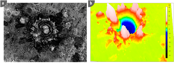 圖 7.用實驗室儀器經過 20 次激光發射后產生的燒蝕坑,可以看到物質噴射。a) 用共聚焦顯微鏡 S neox 拍攝到圖像;b) 燒蝕坑的 3D 視圖