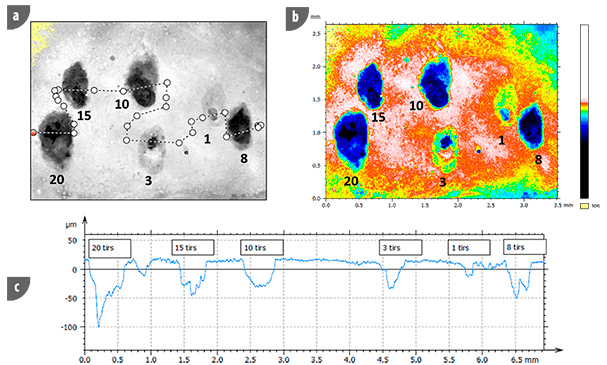 圖 5.燒蝕坑深度(單位:µm);a) 和 b)頂視圖形貌,c) 剖面圖