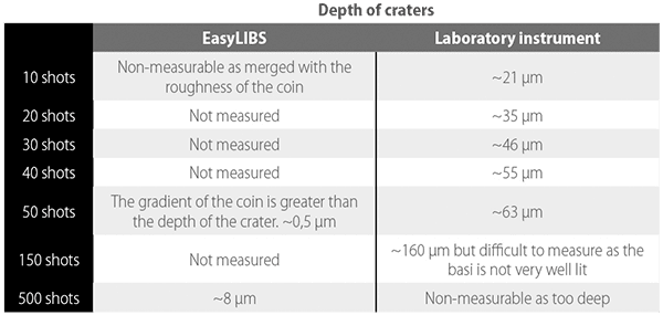 表 1 顯示了使用 EasyLIBS 和實驗室儀器在進行了不同次數的激光發射后產生的燒蝕坑深度對比。此外,圖 8 和圖 9 分別顯示了兩種 LIBS 儀器在經 50 次和 500 次激光發射后產生的燒蝕坑的 2D 圖片。