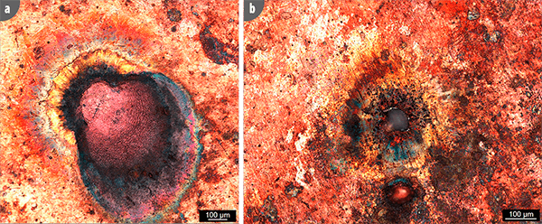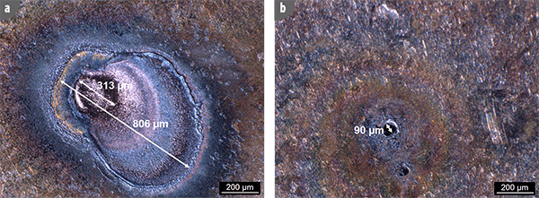圖 9.燒蝕坑的形狀和大小 a) 使用便攜式儀器 (EasyLIBS) 經過 500 次激光發射后產生的燒蝕坑;b) 使用實驗室儀器經過 500 次激光發射后產生的燒蝕坑