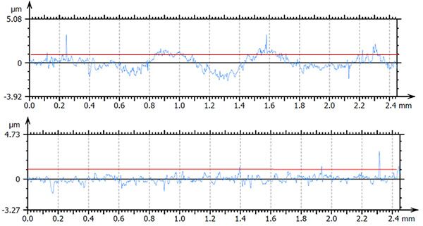 如果造成缺陷的因素中涉及到機械加工,則可以定期進行粗糙度分析,以幫助評估標記。但是,接觸式觸針 2D 輪廓儀在這種復(fù)雜的成品鈦零件上留下的標記會造成不易被接受的缺陷。因此,我們選擇了非接觸式光學(xué)表面輪廓儀檢查來識別缺陷來源,測量旨在避免這種缺陷的制造變更的效率,并為不合格品設(shè)定定量閾值。