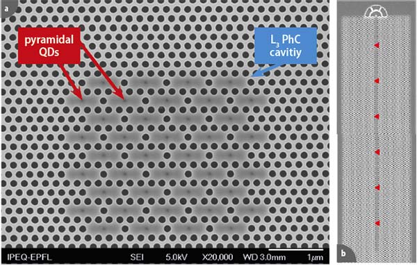圖 1.a) 嵌入耦合 L3PhC 腔中的量子點(暗點)網絡的 SEM 圖像;b) 光子晶體的 SEM 圖像,頂部帶有一個輸出耦合器,并包含六個量子點(用紅色三角形表示)。