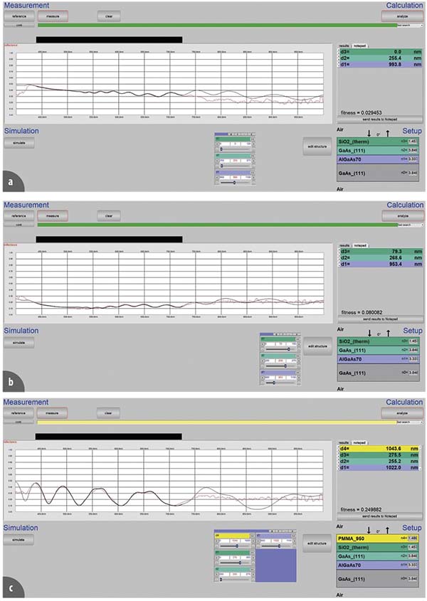 圖4. A) 砷化鎵/Al0.7Ga0.3As/砷化鎵樣品的反射光譜,模型擬合顯示半導體厚度(255 和 994 nm)。擬合顯示頂部沒有二氧化硅層;b) 涂覆有二氧化硅的砷化鎵/Al0.7Ga0.3As/砷化鎵樣品的反射光譜,模型擬合顯示半導體厚度(269 和 953 nm)和二氧化硅層厚度 (79 nm);c) 涂覆有二氧化硅和 PMMA 的砷化鎵/Al0.7Ga0.3As/砷化鎵樣品的反射光譜,模型擬合顯示半導體厚度(255 和 1022 nm)以及二氧化硅層厚度 (276 nm) 和 PMMA 層厚度 (1044 nm)。