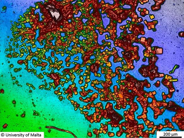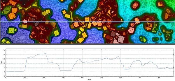 通過使用 Sensofar 的 S neox 3D 光學(xué)輪廓儀,研究人員得以測(cè)量涂有鹽的玻璃顯微鏡載物片。使用 2.5 倍明場(chǎng)物鏡獲取樣品的放大概觀,并在進(jìn)行測(cè)量之前定位感興趣的區(qū)域。