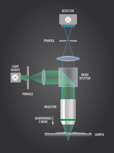 共聚焦技術能夠測量表面高度,將常規圖像轉換成光學剖面,其中,物鏡焦深范圍內的那些區域的信號被保留,改善了圖像對比度、橫向分辨率和系統噪聲。