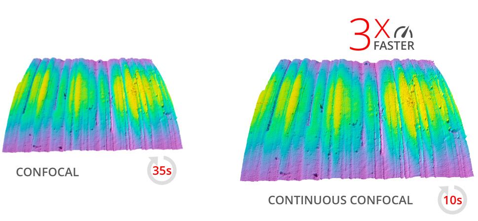 共聚焦測量技術中革命性的一步,將采集時間穩步減少 3 倍。連續共聚焦模式通過同時掃描面內和 Z 軸,避免了經典共聚焦的離散(耗時)面與面采集。對于減少大面積掃描和大 Z 掃描的采集時間至關重要。