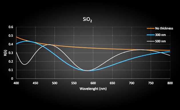 透明層沉積在表面上時,其反射率會變化。該系統(tǒng)獲取可見范圍內(nèi)樣本的反射光譜,并與軟件計算的模擬光譜進行比較,對層厚進行修改,直到找到匹配的厚度。對于薄膜,厚度與光波長類似,我們沿著光譜獲得波浪狀的反射率響應(yīng)。