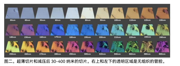 在30nm至400nm范圍內切割切片,并在切片時和在CHCI3蒸汽”拉伸”(減壓)后拍照。設置相機的增益和曝光設置,使得生成的圖像與通過立體顯微鏡直接觀察到的顏色和亮度緊密匹配。使用圖像處理軟件lmageJ(NIH,USA)排列切片圖像,以產生圖2。