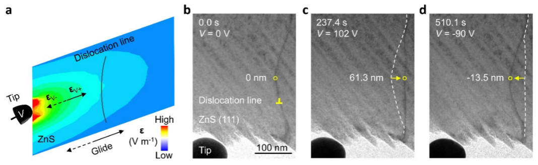 圖1. 電場驅動單個位錯移動。(a)實驗裝置示意圖,通過金屬針尖對樣品加載電壓。(b)位錯線的初始位置。(c)加載電壓達到正102 V時,位錯線運動到右側位置。(d)加載電壓達到負90 V時,位錯線運動到左側位置。