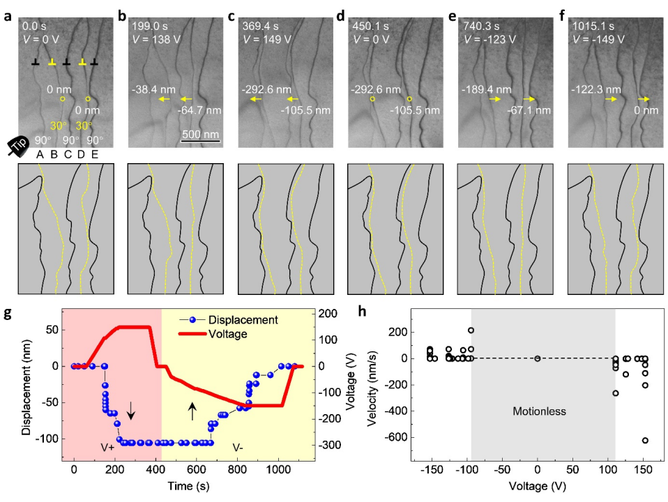 他們也對比了電場下不同位錯類型的移動性。如圖2所示,他們首先找到了30° 部分位錯(位錯B和D)和90° 部分位錯(位錯A,C和E)交替排列的區域。在外加電場下,30° 部分位錯依賴電場方向來回移動,但是90° 部分位錯在整個過程中沒有移動。這個結果說明30° 部分位錯在電場下的移動性比90° 部分位錯更高。而且可以直接觀察到電場下位錯移動的特點,包括釘扎-去釘扎現象,以及kink傳播過程。這個對比實驗揭示了電場下位錯移動性依賴位錯類型,以及位錯運動的特點。