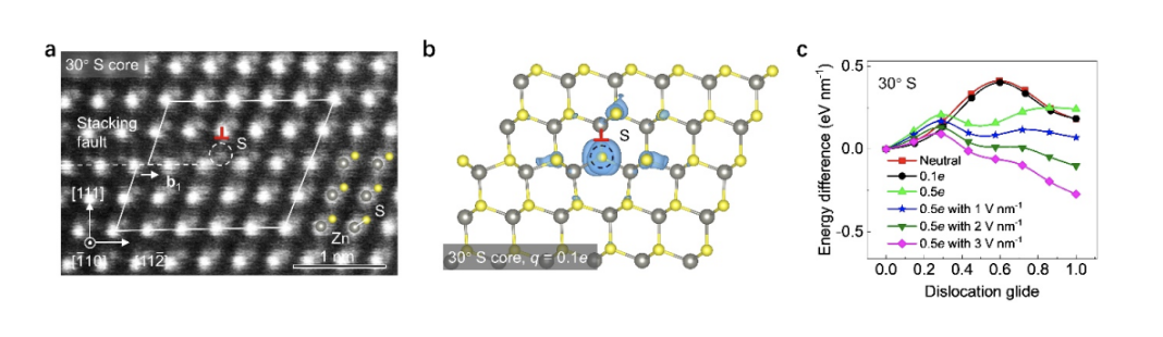 為了理解電場如何驅動位錯移動,他們表征了位錯核的原子結構,然后結合密度泛函理論計算分析了位錯核的電子結構。圖3a展示了一個典型30° S位錯核的原子結構。較亮的圓斑對應的是Zn原子列,較暗的圓斑是S原子列。理論計算表明帶負電的30° S位錯比電中性狀態更加穩定,因此實際樣品中的位錯很可能是帶電的,位錯核附近的電荷分布如圖3b所示。這種帶電位錯使得電場可以通過Coulomb相互作用來控制位錯運動。圖3c展示了位錯滑移勢壘在帶電狀態以及在外加電場下的變化趨勢。他們也分析了ZnS中另外三種類型的位錯,發現電場都可以降低位錯的滑移勢壘,從而從能量角度解釋了電場控制位錯移動的機制。
