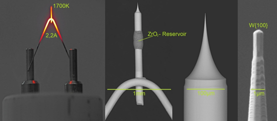 圖 肖特基熱場發射電子槍燈絲的針尖:為了提高分辨率,電子光斑越小越好,因此現代電子槍針尖都非常細