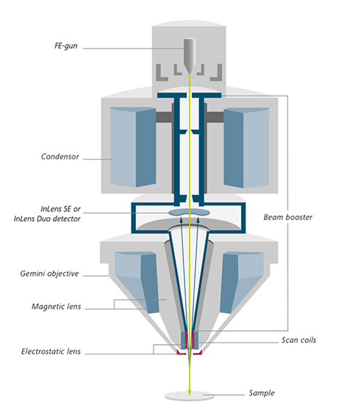 - Gemini in-lens 的探測確保了信號探測的效率,通過二次檢測(SE)和背散射(BSE)元件同時減少成像時間。