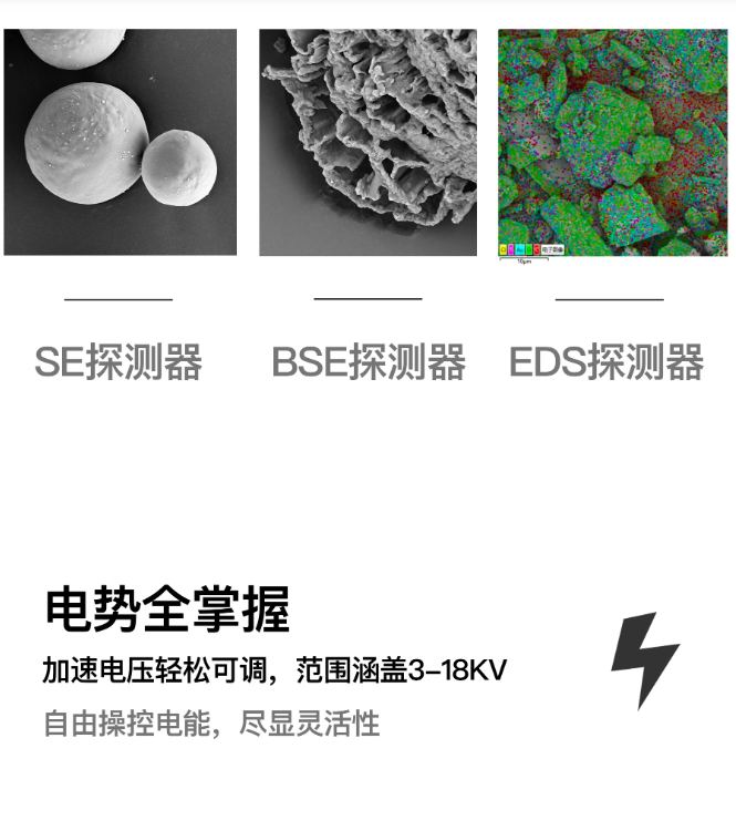 ▲ 信號多樣:可選配SE、BSE、EDS三種信號探測器,實現(xiàn)成分和形貌分析。