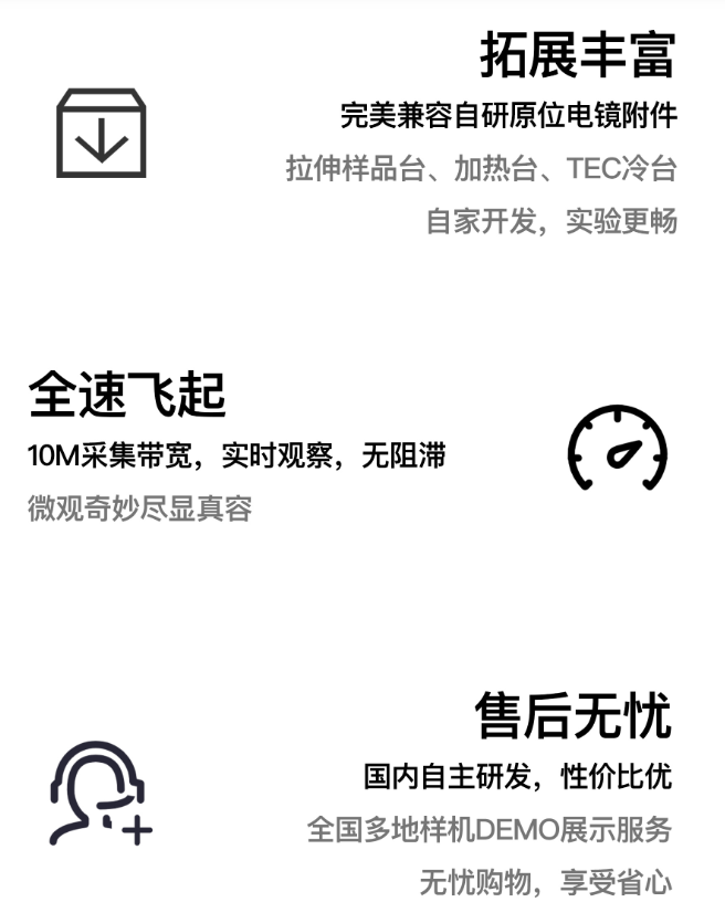 ▲ 拓展豐富:具備豐富的原位拓展功能,兼容自研原位電鏡附件,如加熱臺、TEC冷臺等。