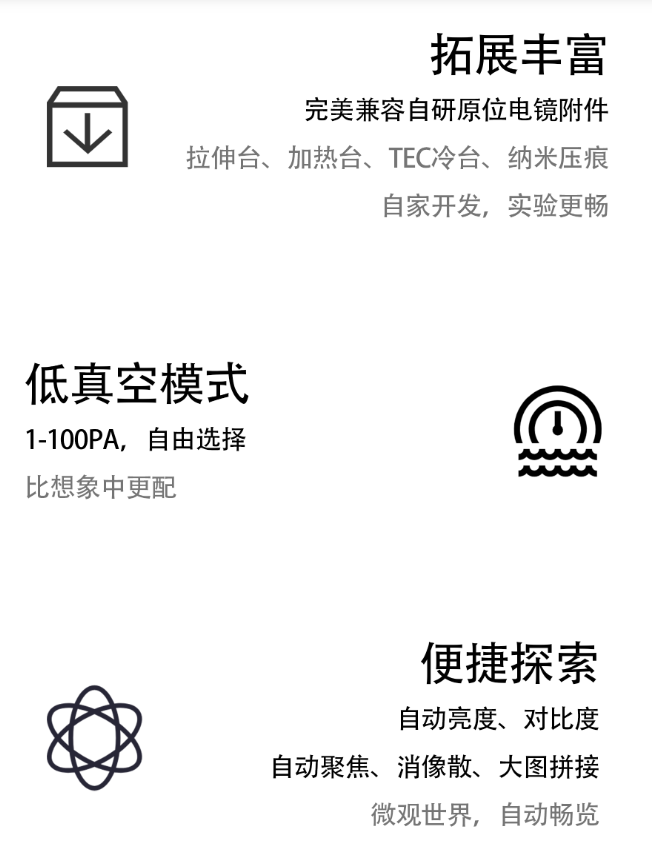 豐富的原位拓展功能,可兼容自研原位電鏡附件(拉伸樣品臺、加熱臺、TEC冷臺等)。