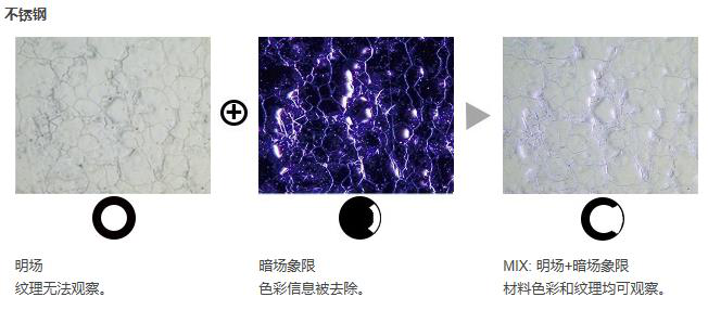 MIX技術(shù)將暗場(chǎng)與另一種觀察方法(如明場(chǎng)或偏振)相結(jié)合,讓您能夠觀察傳統(tǒng)顯微鏡難以觀察的樣品。圓形LED照明器的定向暗場(chǎng)功能可在指定時(shí)間照射一個(gè)或多個(gè)象限,從而減少樣品光暈,更好地觀察表面紋理。