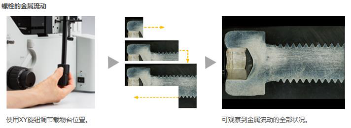 通過多圖像拼接(MIA)功能, 您轉(zhuǎn)動(dòng)手動(dòng)載物臺(tái)上的XY旋鈕即可輕松完成圖像拼接—電動(dòng)載物臺(tái)為選配。奧林巴斯Stream軟件采用模式識(shí)別生成全景圖像,特別適合用于檢查滲碳和金屬流動(dòng)情況。