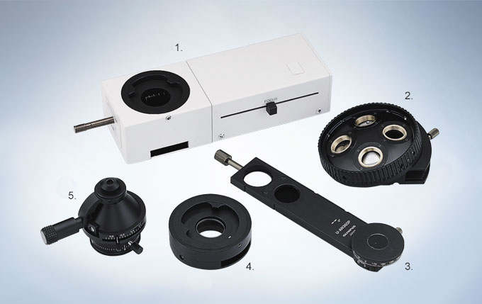 旋轉載物臺安裝的旋轉對中裝置能夠順暢地旋轉標本。此外,為了實施精確測量,每隔45度就有一個咔噠停止裝置。如果增加了雙機械載物臺,還可以進一步完成X-Y的微小移動。